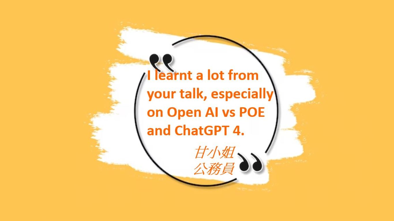 現時,我們提供三個課程:「POE全面商業應用」、「Open AI初階商業應用」及「Open AI進階商業應用」三個層次的課程,前兩者適合對ChatGPT零認識的人士;而「Open AI進階商業課程」適合對Open AI 已有操作經驗的人士。 若只希望針對文書寫作,建議可報讀Open AI 的初階課程;否則一般來說,POE可適合大部份人士使用。 若希望全面提升工作效率,包括繪圖、數據視像化、即時生成PowerPoint等、建議學習Open AI進階商業應用。 因此,你可根據對ChatGPT的熟悉程度和實際需求,選擇最適合的課程。