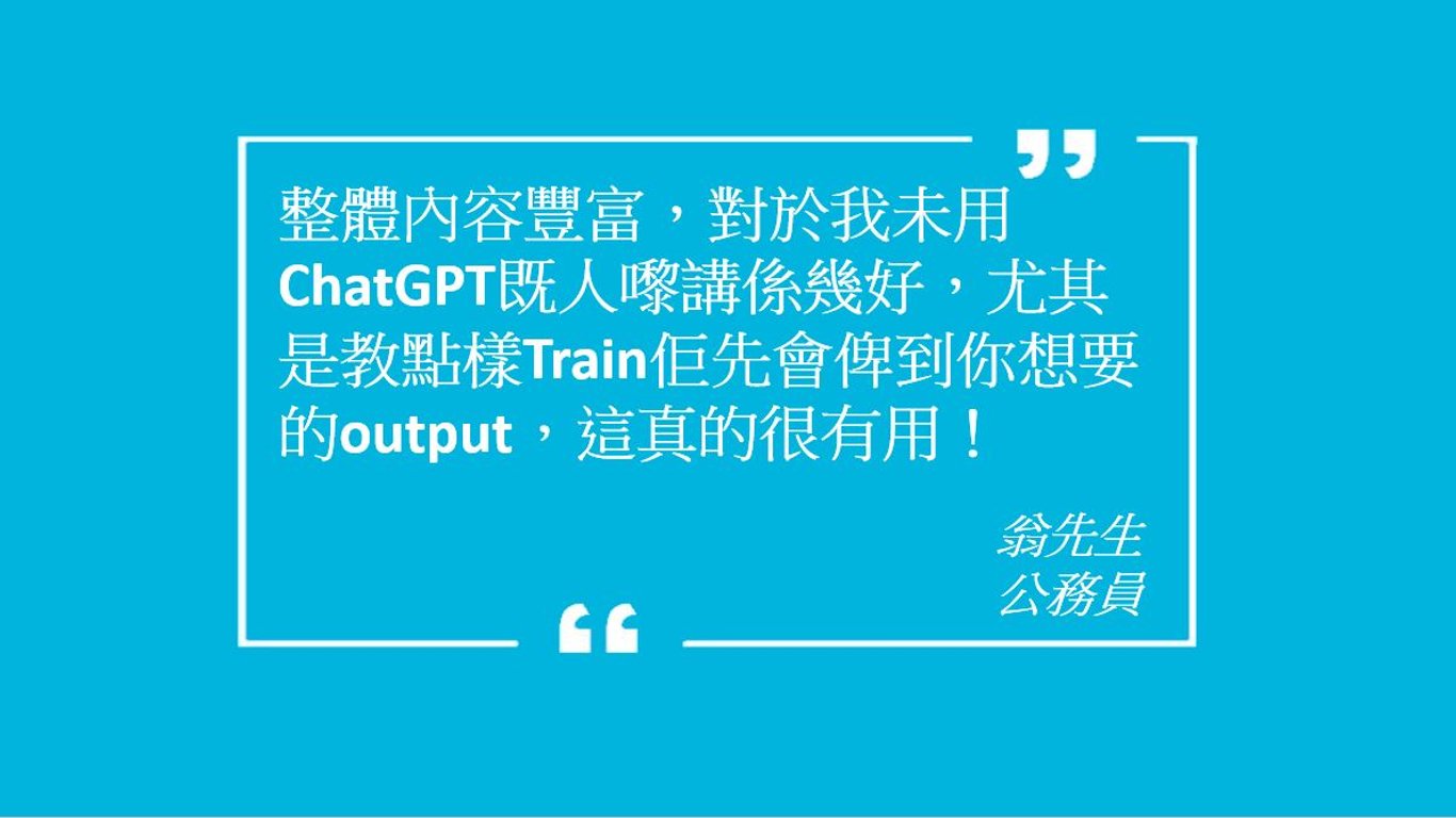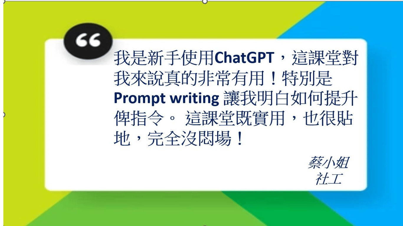 課程著重實際ChatGPT應用技巧,少複雜IT理論,讓您輕鬆掌握這工具,能得心應手使用。